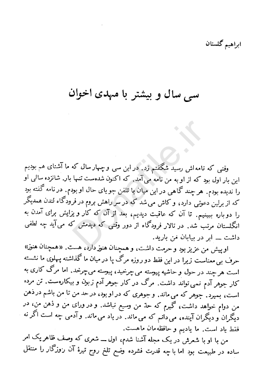 ابراهیم گلستان در مقاله ی سی سال و بیشتر با مهدی اخوان ثالث تلاش می کند تصویری روشن و نزدیک از دوست دیرینه اش، اخوان، ارائه دهد. این نوشته نه یک زندگینامه خشک است و نه صرفا تحلیلی ادبی بلکه ترکیبی ست از خاطره، تجربه ی زیسته و نگاه انتقادی.